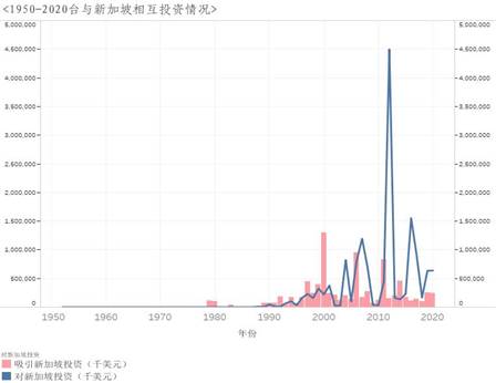 臺與新加坡相互投資大致始于上世紀70年代,此前被記錄在案的僅零星小額投資。據臺經濟統計部門統計,1972年新加坡對臺投資35萬美元,2019年增長至2.5億美元,2020年約2.4億美元,占臺吸引外資總額的2.7%。1972年臺商赴新加坡投資約40.7萬美元,2019年增長至6.4億美元,2020年約6.4億美元,?約占臺對外投資(大陸地區除外)總額的5.4%。