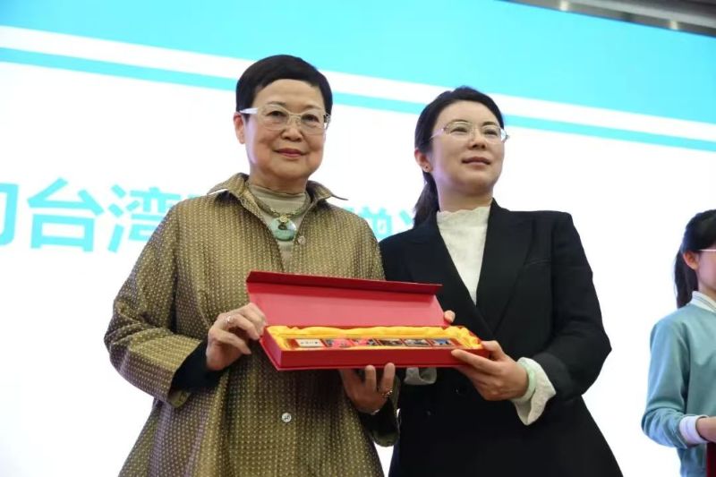 活動現(xiàn)場,北京八中向臺灣師生贈送“詩禮傳家久,炎黃一脈長”書法作品,臺灣嘉賓回贈錦旗和典籍。