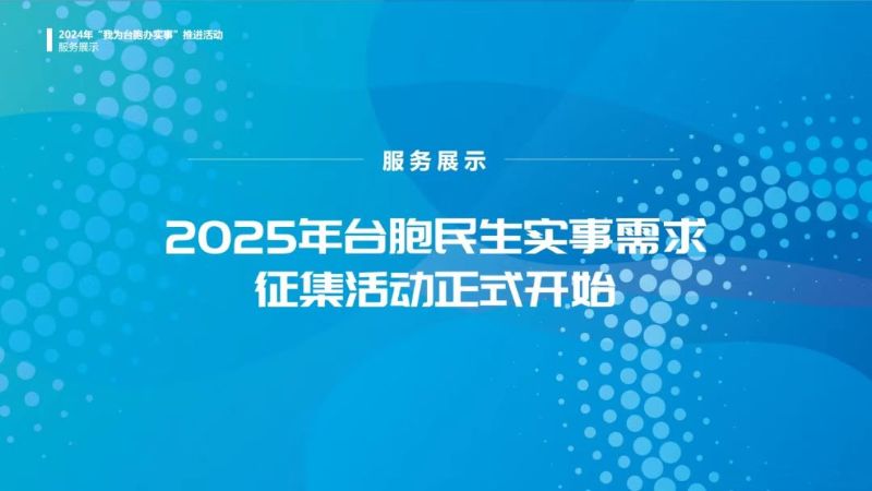 為持續深化“我為臺胞辦實事”工作,進一步促進和完善臺灣同胞在北京享受同等待遇的政策措施,北京市臺辦現面向在京臺胞正式啟動“2025年我為臺胞辦實事”民生實事需求征集活動。