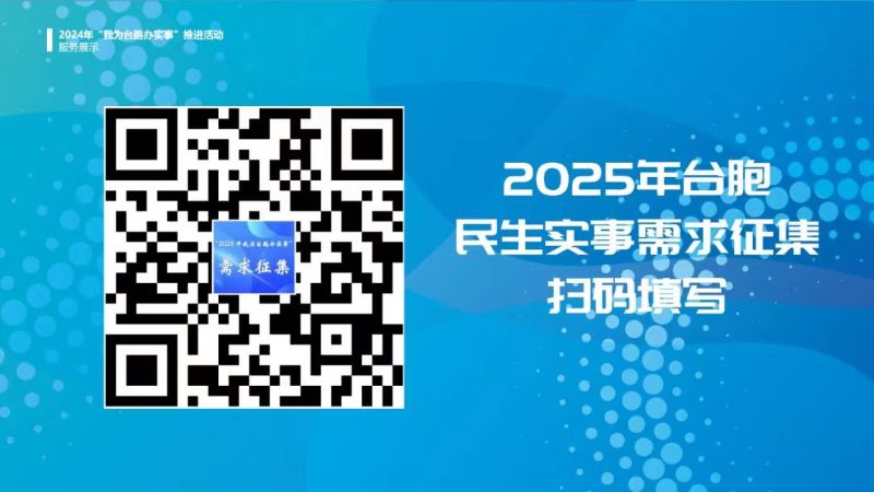 為進一步深入了解在京臺胞在民生領域的困難問題和意見建議,市臺辦現面向全體在京臺胞開展民生實事需求征集活動。我們誠摯邀請廣大在京臺胞積極參與,將您在居住、教育、醫療、就業、創業等方面的困難和需求反饋給市臺辦。臺胞的每一條意見和建議,都將作為我們制定“2025年我為臺胞辦實事”活動項目的重要參考依據。